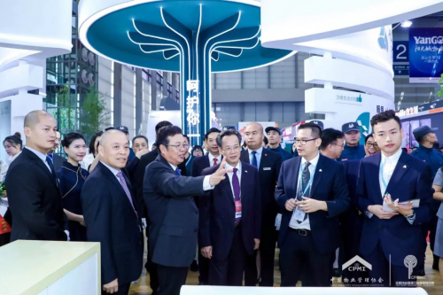 ▲中物協(xié)沈建忠會長(前排左三)與其他重要領(lǐng)導(dǎo)參觀雅生活展位