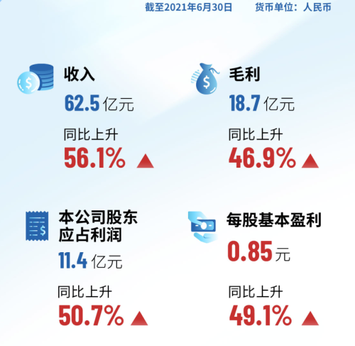 2021年上半年,集團(tuán)業(yè)績實現(xiàn)高質(zhì)量發(fā)展。公告顯示,集團(tuán)上半年營業(yè)額為人民幣62.47億元,較去年同期增長56.1%;毛利18.73億元,同比增加46.9%,毛利率為30.0%;股東應(yīng)占利潤為11.42億元,同比增加50.7%。每股基本盈利為0.85元。