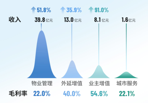 通過精細(xì)化運(yùn)營及科技賦能,雅生活集團(tuán)運(yùn)營效益穩(wěn)步提升,收入結(jié)構(gòu)進(jìn)一步優(yōu)化,核心業(yè)務(wù)占比提升至近八成,核心業(yè)務(wù)毛利占比超七成。其中,物業(yè)管理服務(wù)收入同比增長51.8%至39.77億,外延增值服務(wù)收入同比增長35.9%至13.03億元,業(yè)主增值服務(wù)收入同比增長90.9%至8.07億元,城市服務(wù)收入達(dá)1.59億元。